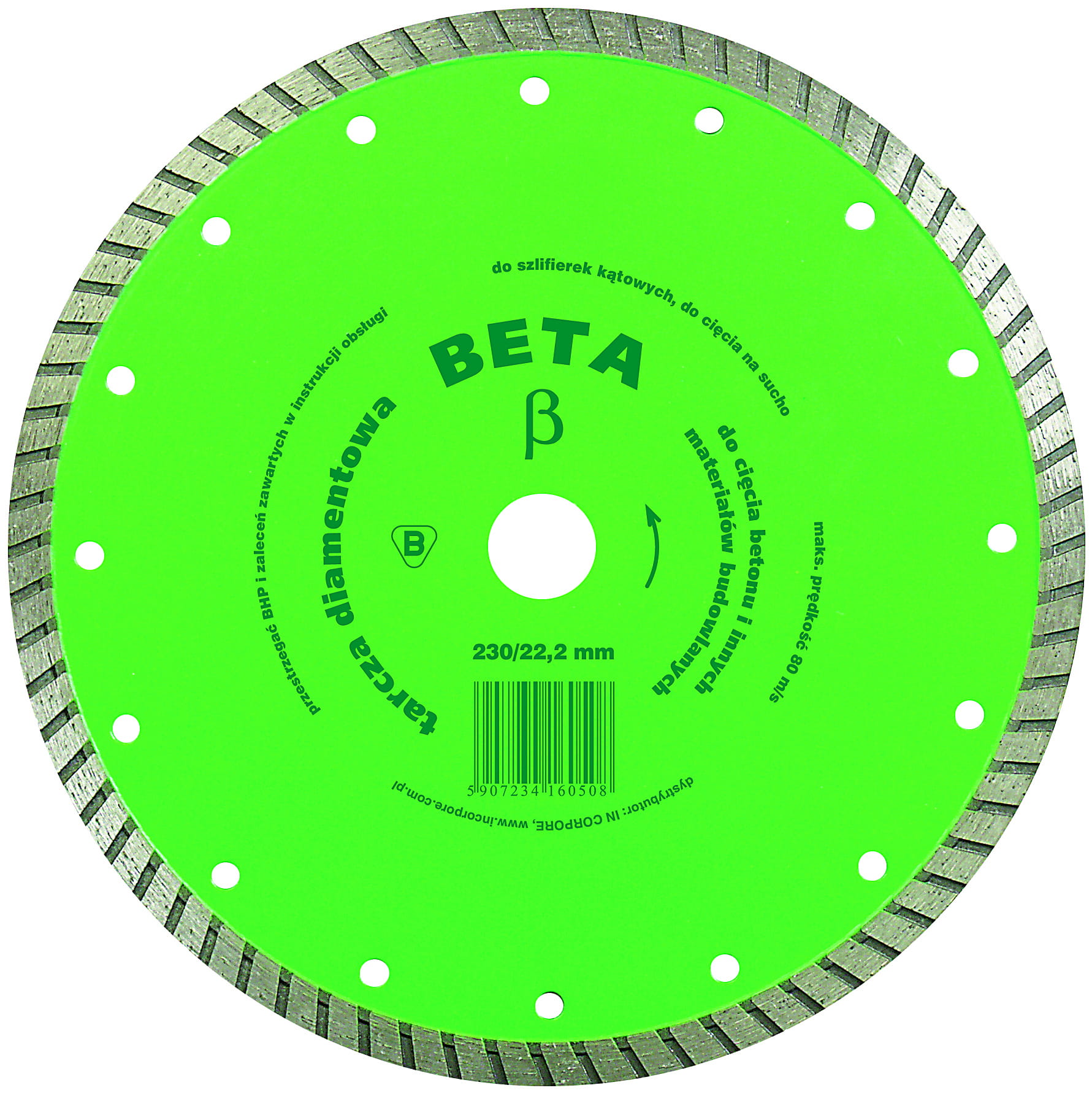 Tarcza Beta 115 mm może być wykorzystywana do cięcia materiałów budowlanych za pomocą szlifierki kątowej. Tarcza jest z obwodem zamkniętym typu TURBO. Tarczą o średnicy 115 mm można pracować na sucho. Średnica otworu to 22,2 mm.