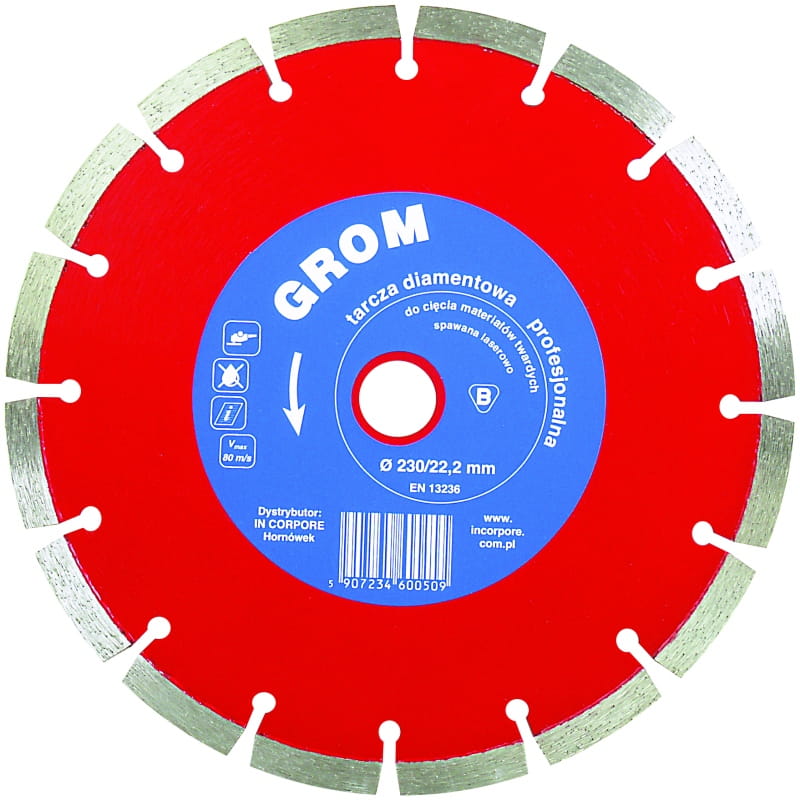 Profesjonalna segmentowa tarcza diamentowa Grom 115 mm firmy IN CORPORE do szlifierek kątowych i spalinowych maszyn ręcznych. Tarcza jest spawana laserowo. Tarczą o średnicy 115 mm można pracować na sucho. Średnica otworu to 22,2 mm.