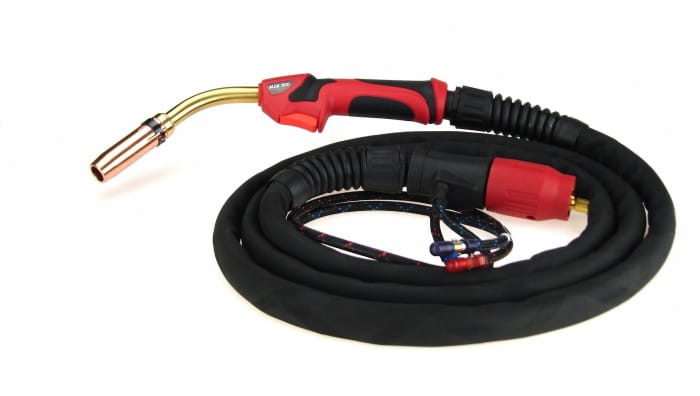 Profesjonalny uchwyt spawalniczy do urządzeń MIG chłodzony cieczą. Prąd spawania dla cyklu pracy 60%: 500A (gaz CO2), 450A (mieszanka Ar/CO2). Długość 5 metrów.