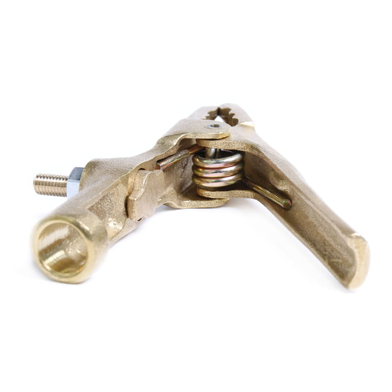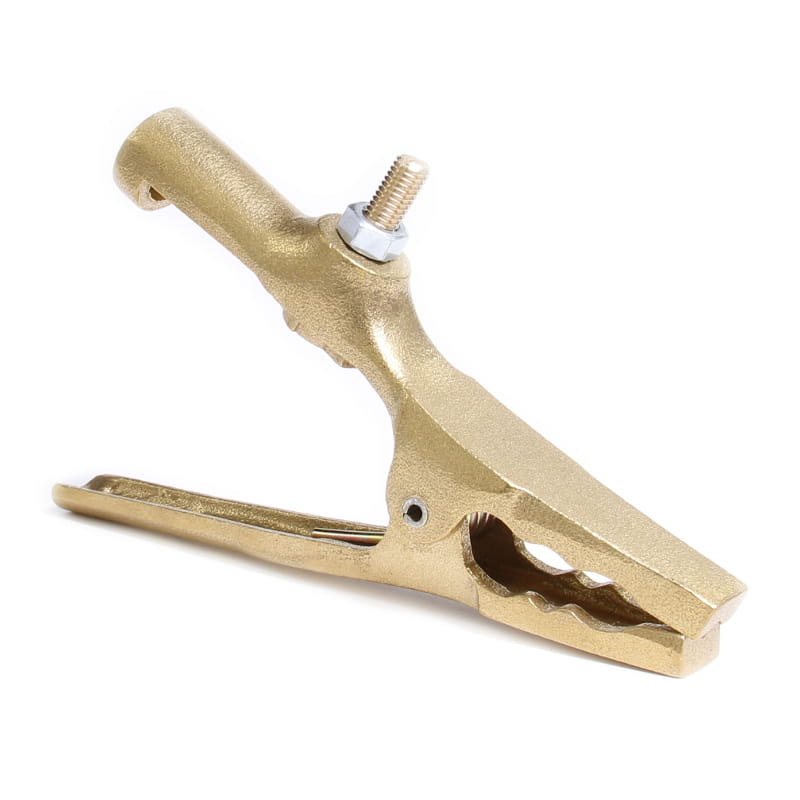Mosiężny zacisk spawalniczy Alligator 350 to uchwyt masowy, który wytrzymuje 350A . Uchwyt posiada mosiężne szczęki które, dzięki solidnej sprężynie, bardzo dobrze trzymają się spawanego materiału. Uchwyt może zacisnąć elementy o średnicy około 30mm. Sugerujemy zastosowanie przewodu spawalniczego przekroju do 50mm2.
